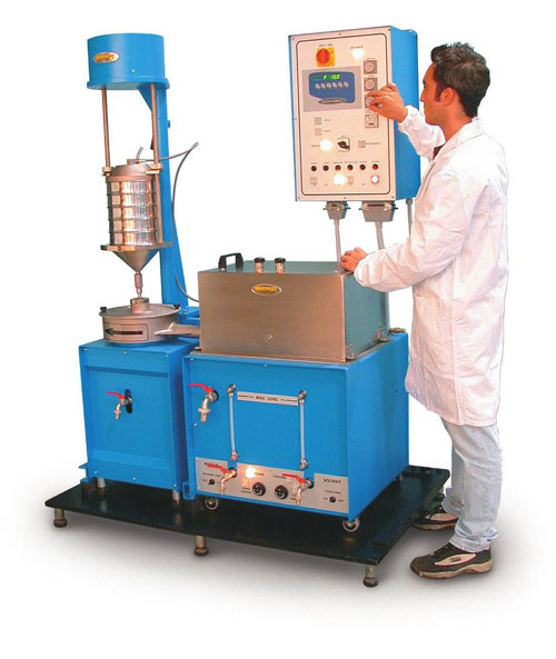 - 一个溶剂回收装置,回收能力为大约50 l/h,配有冷却系统,仪器上显眼的开关控制其自动进行验。 - 一个独立的控制面板使这些功能在一个完整的系统里进行。也可以使用手动功能选择先运行某些特定功能。 该设备包括了: - 两个直径120mm 的不锈钢离心杯 - 四个直径200mm 的不锈钢筛孔:0,075- 0,250-0,800-1,6mm - 一个直径200mm 的筛架,用来提高第一个振筛的容量 - 一套配套振筛使用用的O 环垫圈可按要求给振筛选择不同的筛孔。 一个完整的提取周期大约在25 分钟,每次可对3500g 的 混合物进行提取。 电源: 400 V 3 ph 50 Hz 5,5 kW 总尺寸: 1400x680x1820 mm 总重量: 185 Kg |